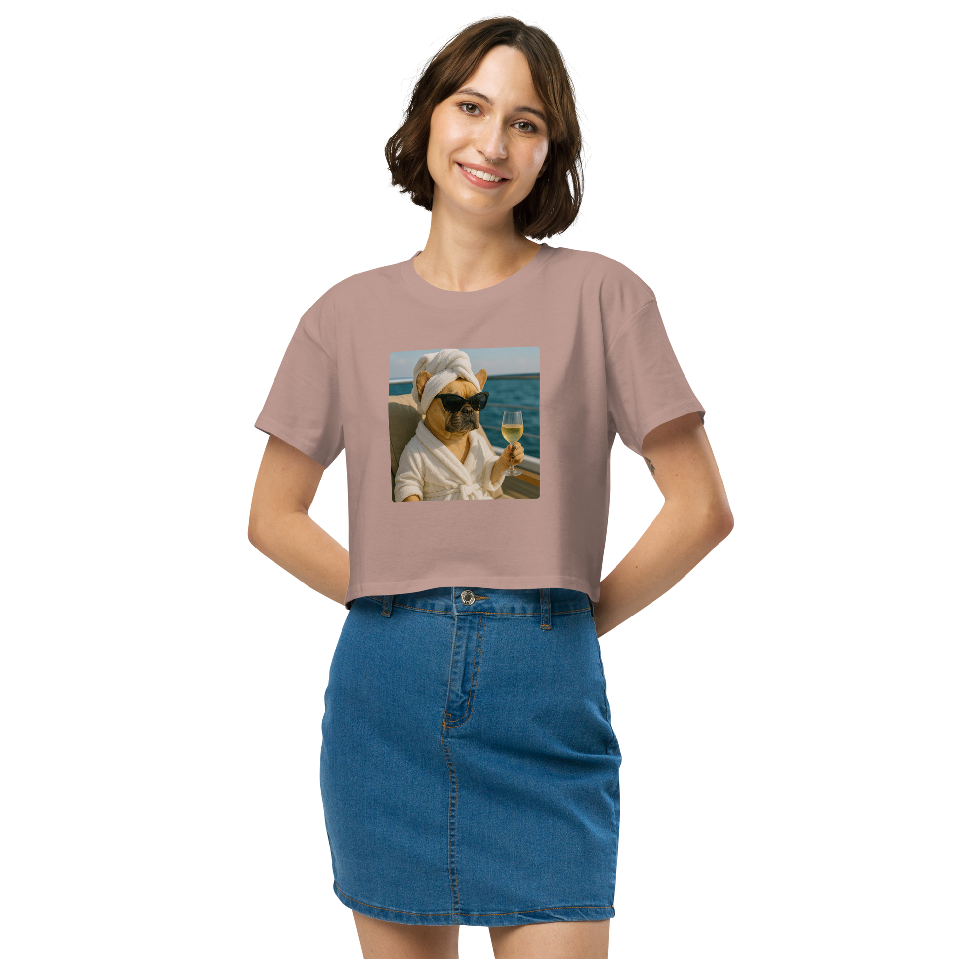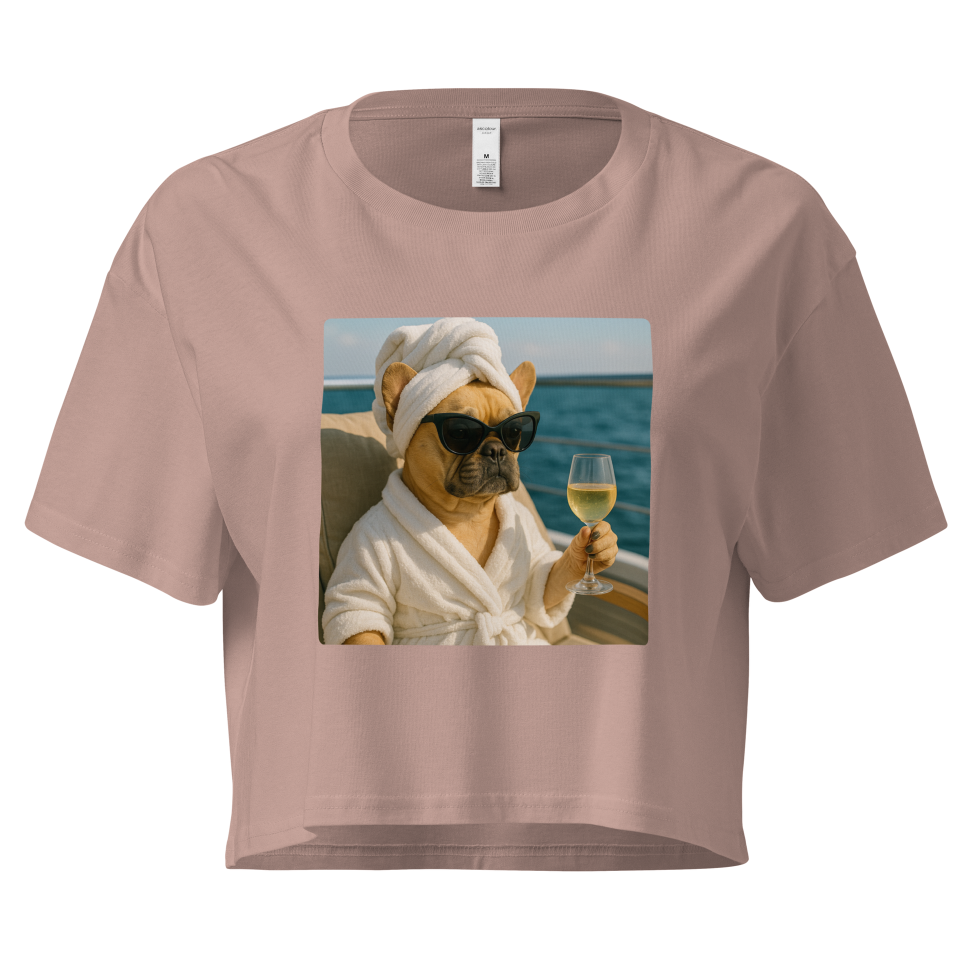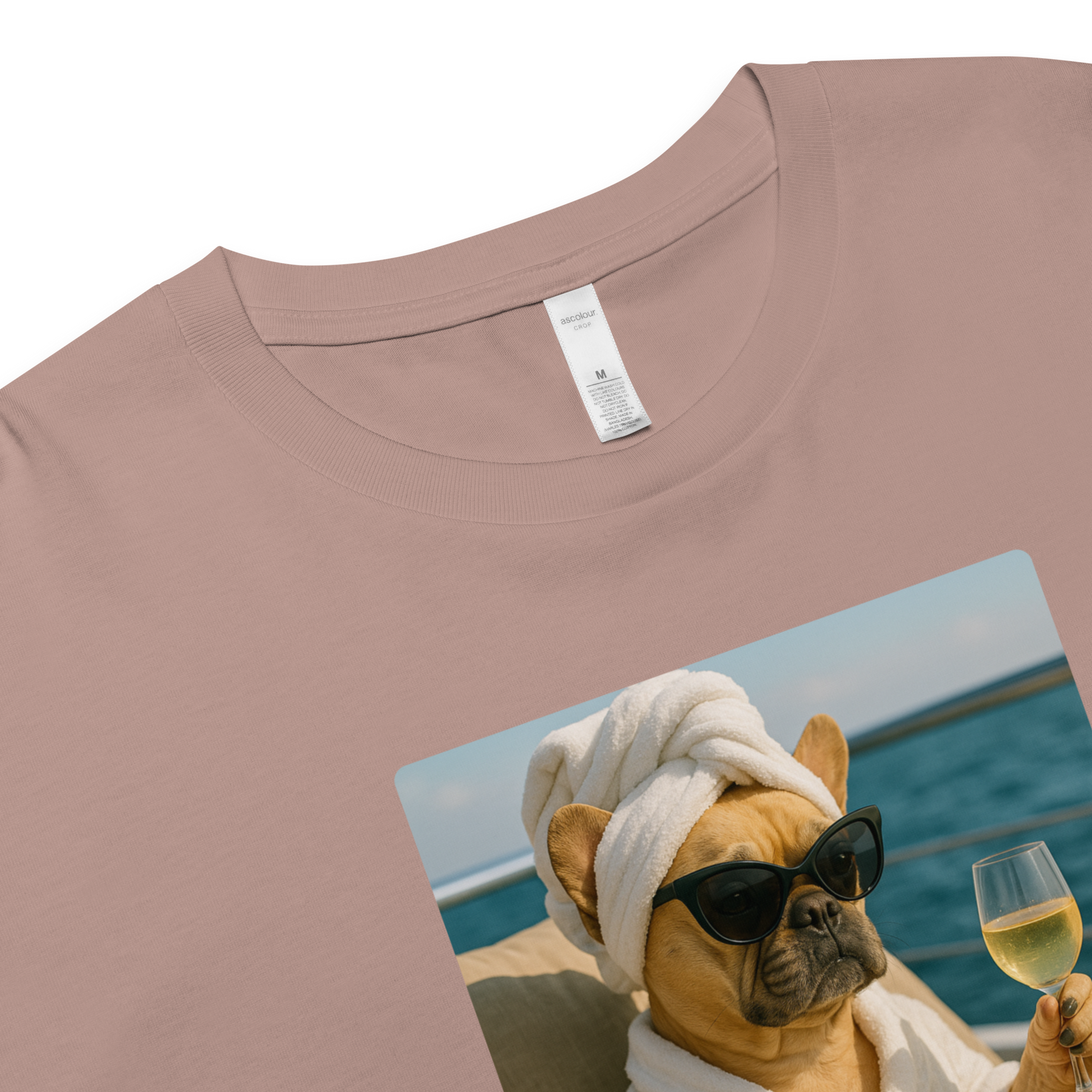 Meet your new go-to crop top: chic, comfy, and full of Frenchie attitude. Featuring an exclusive female Frenchie lounging with a glass of champagne, this tee is for dog moms (and dog lovers) who enjoy a little sparkle with their style.